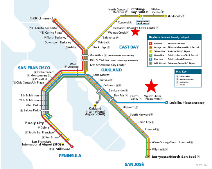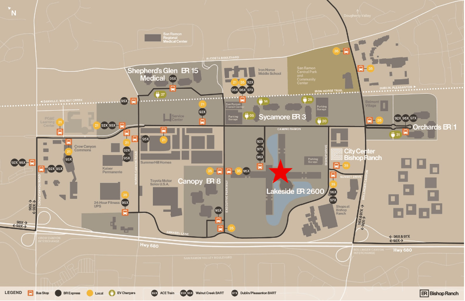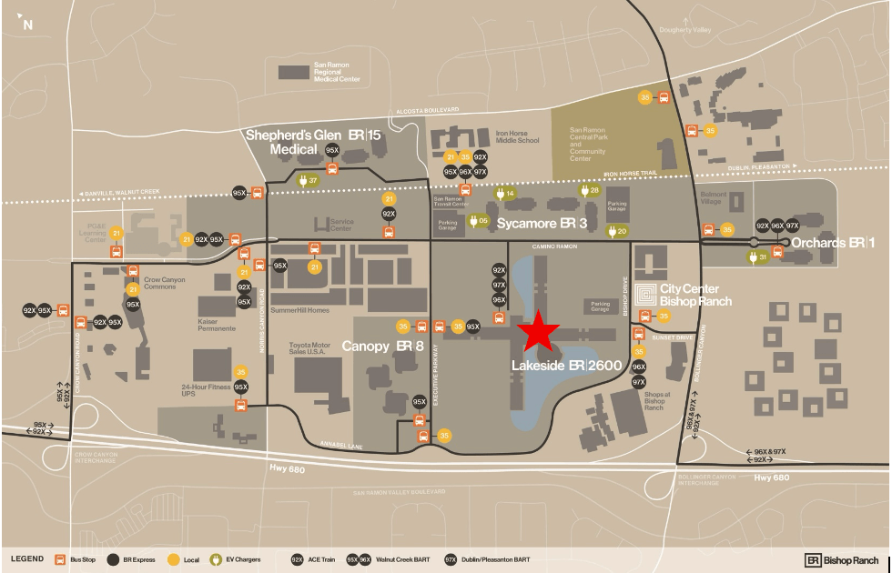 BART has five lines: the Pittsburg/Bay Point (Yellow) line serves Walnut Creek north of Bishop Ranch and the Dublin/Pleasanton (Blue) line serves Dublin/Pleasanton BART south of Bishop Ranch. These stations provide direct and frequent local and express bus connections throughout the morning and evening commute.