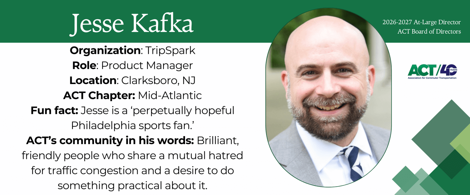 Jesse Kafka is a Mid-Atlantic Chapter member, a Product Manager for rideshare products at TripSpark, and an incoming 2026-2027 At-Large Director on ACT's Board. Get to know Jesse in our November board spotlight!