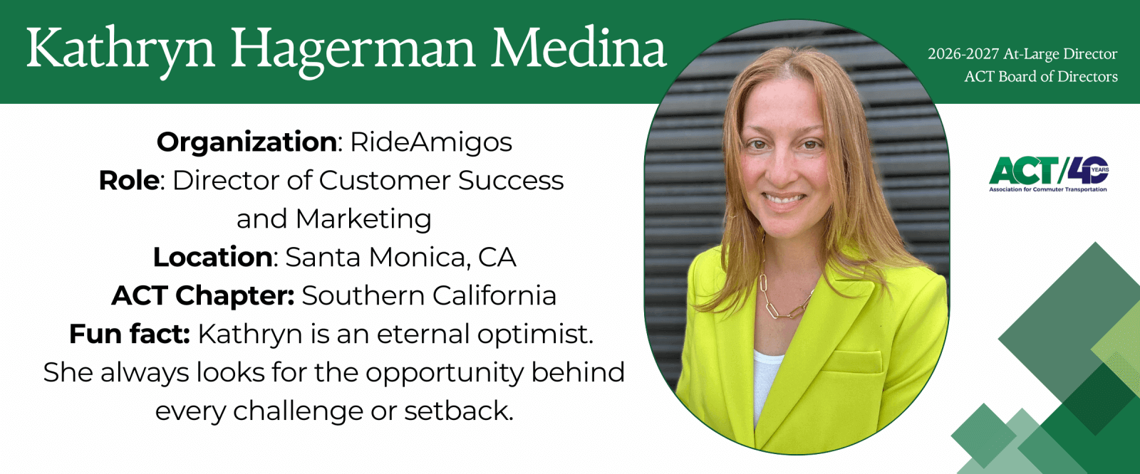 Kathryn Hagerman Medina is a Southern California Chapter member, the Director of Customer Success and Marketing at RideAmigos, and an incoming 2026-2027 At-Large Director on ACT's Board. Get to know Kathryn in our December board spotlight!
