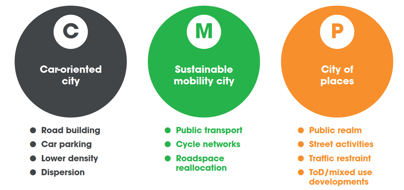 These efforts mirror European cities that have embraced vision-led planning over the course of several decades, which has helped them shift from car-centric planning to prioritize walking, cycling, transit use, and shared mobility. SLR’s analysis of this history as part of the EU’s CREATE project revealed three interlinked, consecutive phases of urban transport evolution: