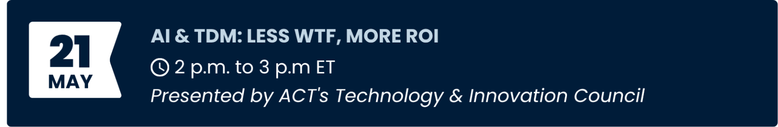 What does AI actually look like in TDM - and where is it delivering real value? Join ACT's Technology & Innovation Council for "AI & TDM: Less WTF, More ROI," an engaging webinar exploring practical, real-world uses of AI in TDM, from smarter planning and integrated data tools to transportation project prioritization.